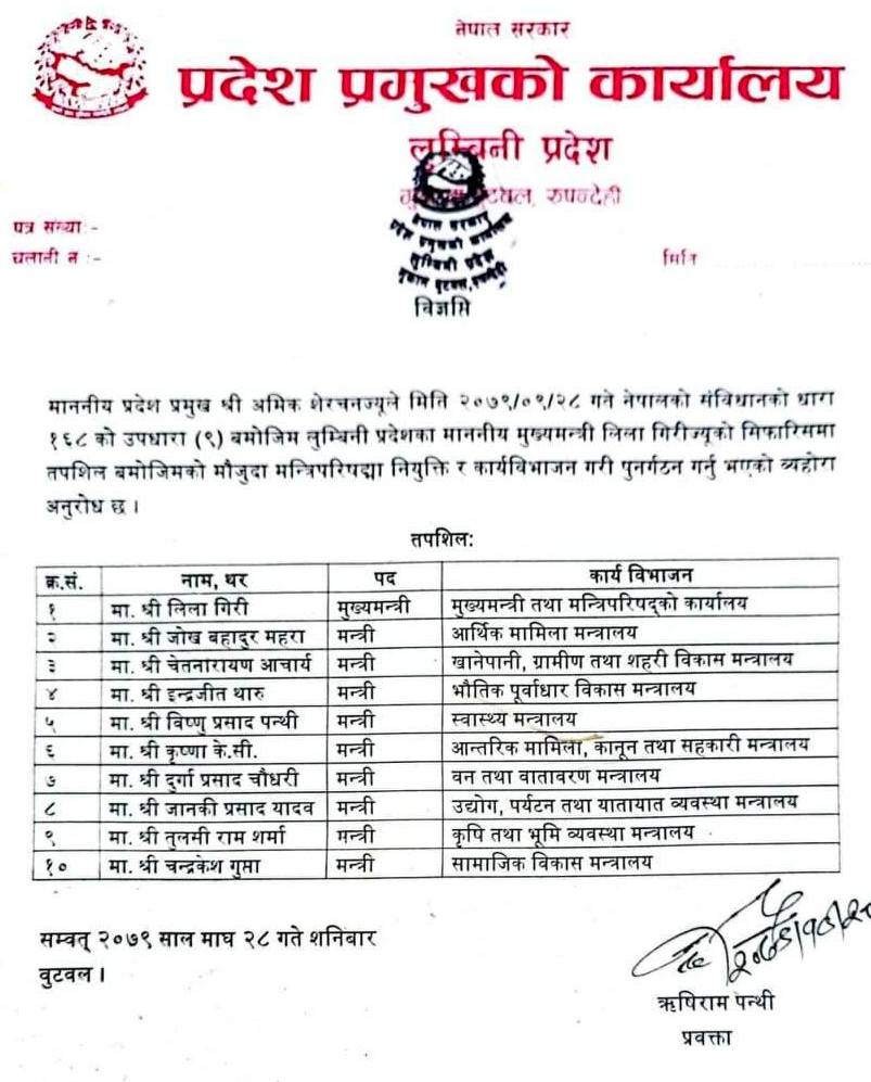 बुटवल । लुम्बिनी प्रदेशमा लीला गिरी नेतृत्वको मन्त्रिपरिषद्ले पूर्णता पाएको छ । मुख्यमन्त्री गिरीको सिफारिसमा प्रदेश प्रमुख अमिक शेरचनले शनिबार संविधानको धारा १६८ को उपधारा ९ बमोजिम मन्त्रिपरिषद् विस्तार गरेका हुन् ।