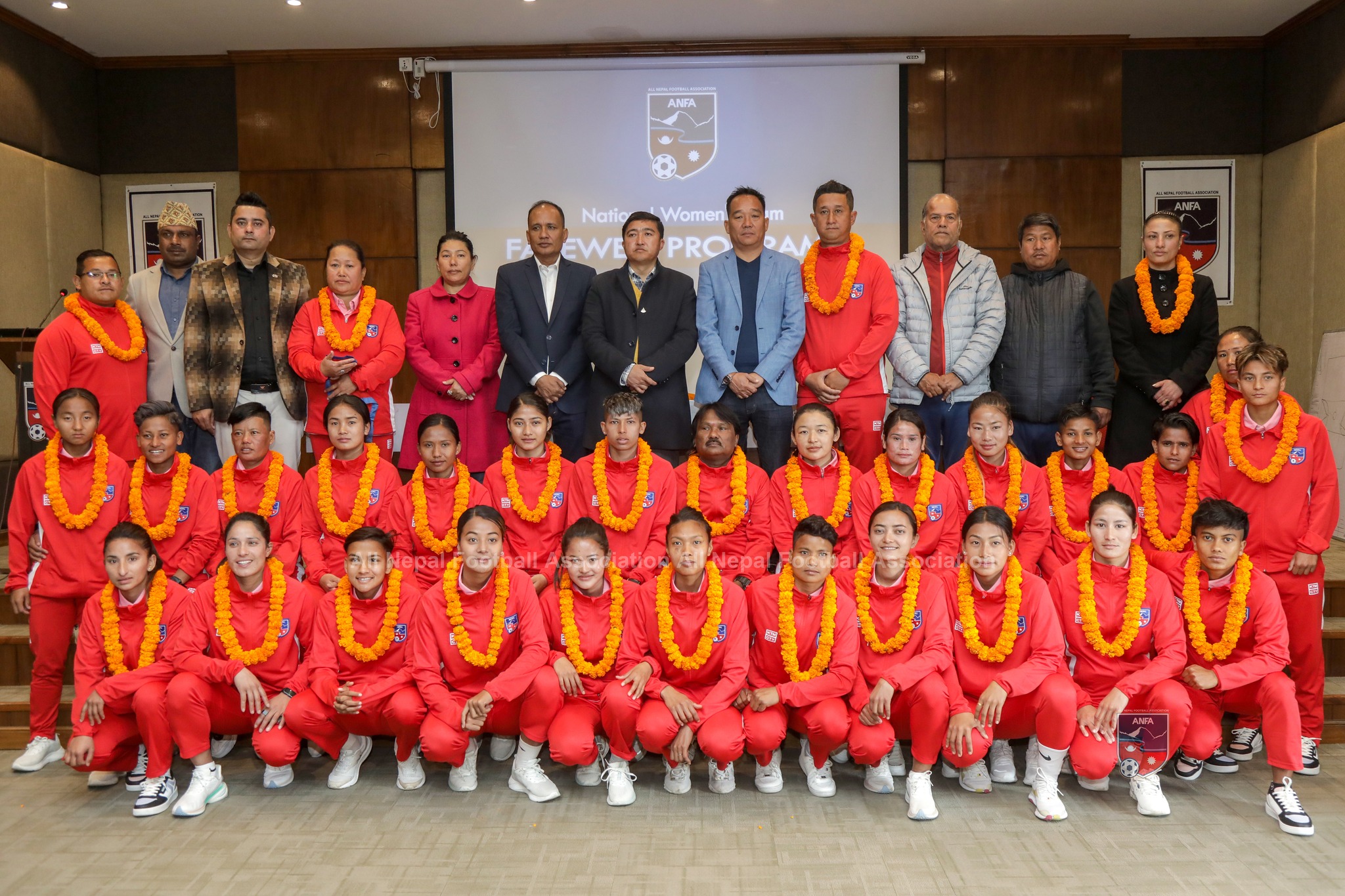 काठमाडौं । अखिल नेपाल फुटबल संघ (एन्फा) ले नेपाली राष्ट्रिय महिला फुटबल टोलीलाई बिदाइ गरेको छ । एन्फाले आइतबार आफ्नो कम्प्लेक्समा भारतसँग मैत्रीपूर्ण खेल खेल्ने जान लागेको महिला फुटबल टोलीलाई बिदाइ गरेको हो ।