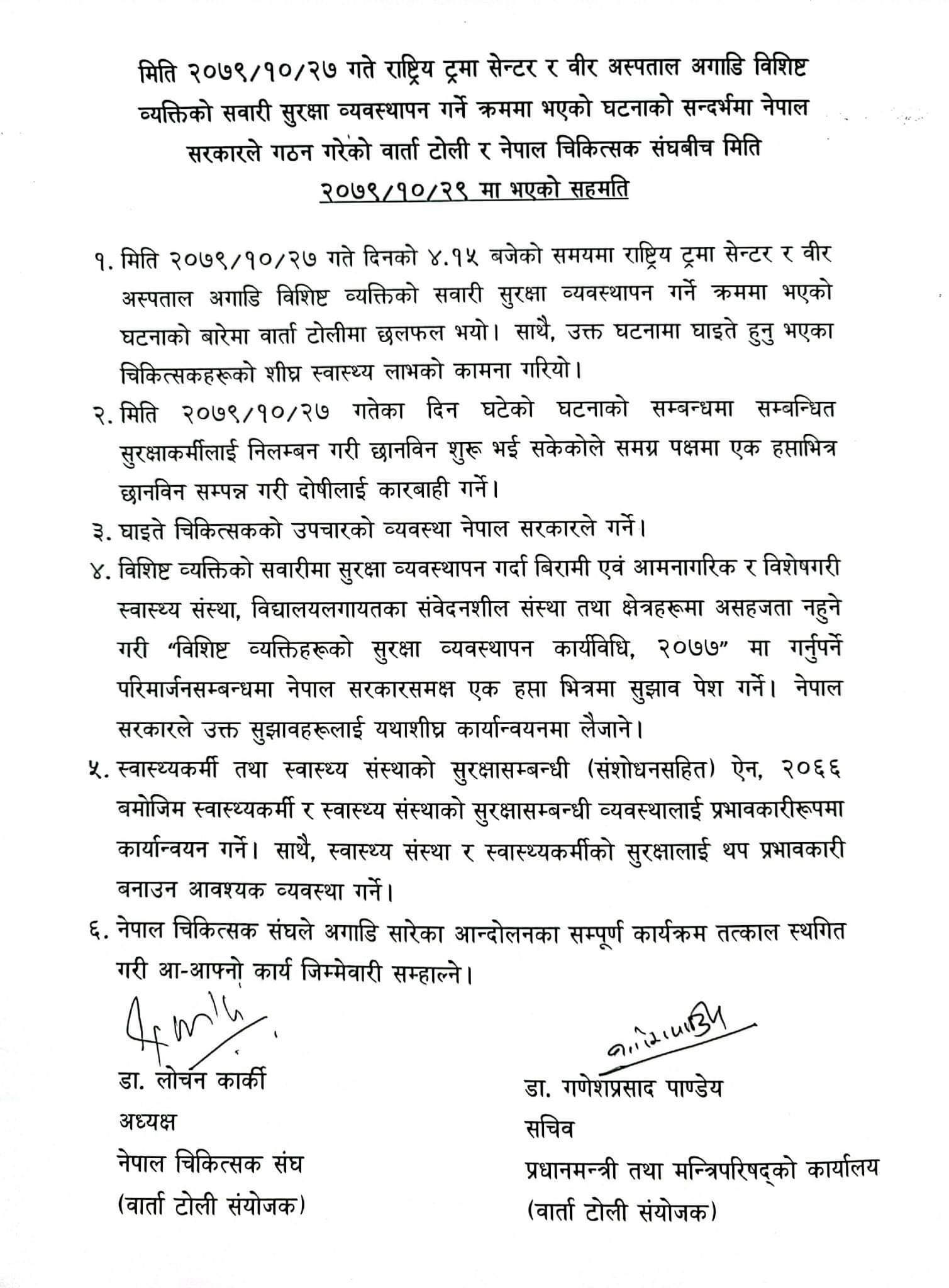 यो सँगै चिकित्सक संघले देशभरका बहिरंग सेवा (ओपीडी) बन्द गरी आन्दोलनको घोषणा गरेका थिए । तत्पश्चात सरकारद्वारा गठित वार्ता टोलीले संघलाई सहमतिमा ल्याउन प्रयास गरेको थियो । सोहीअनुसार संघ र सरकारबीच ६ बुँदे सहमति भएको छ ।