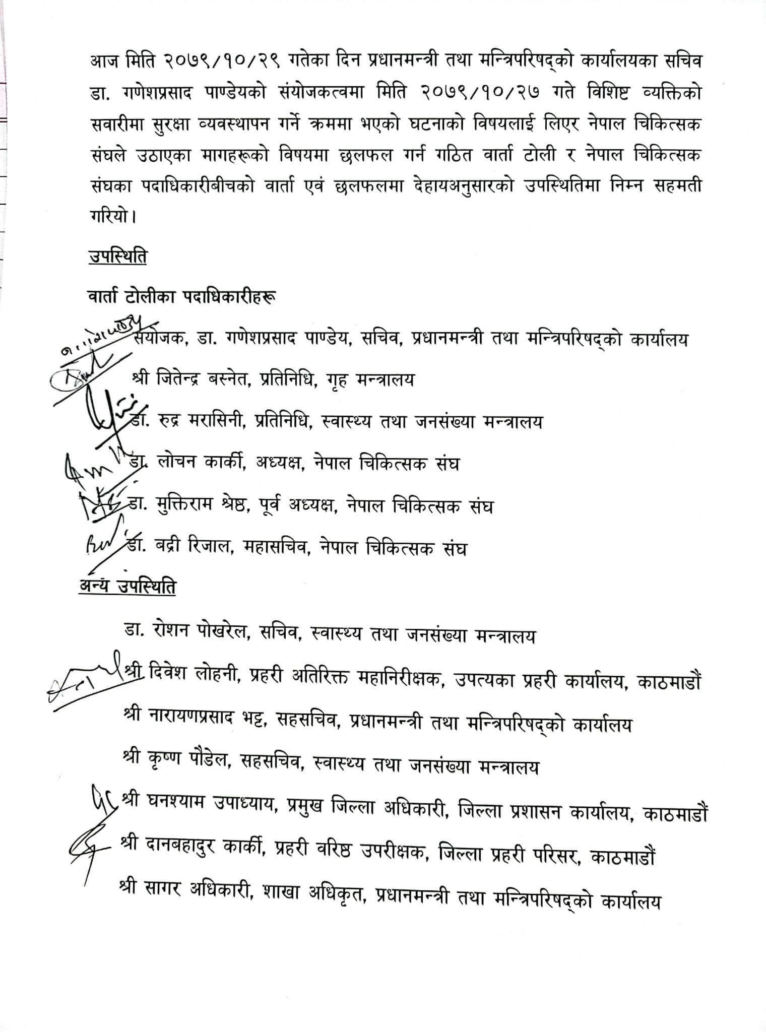 चिकित्सक संघद्वारा आन्दोलनका कार्यक्रम स्थगित, विशिष्ट व्यक्तिको सुरक्षा व्यवस्थापन कार्यविधि परिमार्जन गरिने