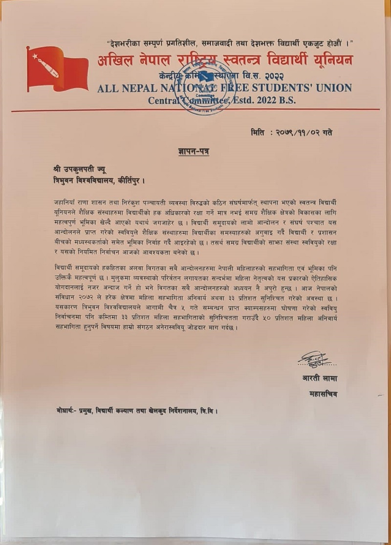 ‘आज नेपालको संविधान २०७२ ले हरेक क्षेत्रमा महिला सहभागिता अनिवार्य अथवा ३३ प्रतिशत सुनिश्चित गरेको अवस्था छ,’ ज्ञापनपत्रमा भनिएको छ, ‘यसकारण त्रिभुवन विश्वविद्यालयले आगामी चैत्र ५ गते सम्बन्धन प्राप्त क्याम्पसहरुमा घोषणा गरेको स्ववियु निर्वाचनमा पनि कम्तिमा ३३ प्रतिशत महिला सहभागिताको सुनिश्चितता गराउँदै ५० प्रतिशत महिला अनिवार्य सहभागिता हुनुपर्ने विषयमा हाम्रो संगठन अनेरास्ववियू जोडदार माग गर्दछ।’