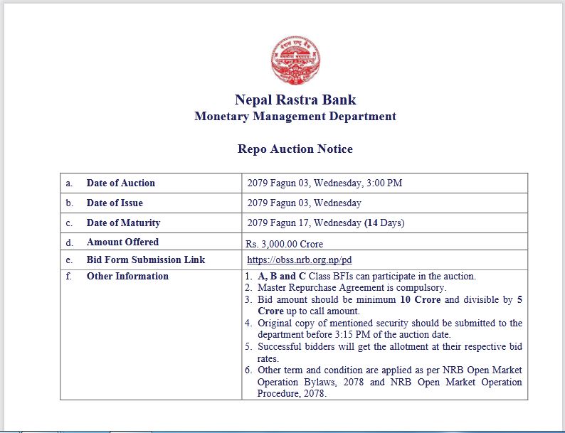राष्ट्र बैंकका अनुसार बुधबार बाँणिज्य बैंक, बिकास बैंक र फाईनान्स कम्पनीहरुको लागि उक्त परिमाणका रिपो जारी गरिएको हो । रिपोको परिपक्व हुने अवधि १४ दिन अर्थात यही फागुन १७ गते तोकिएको छ ।