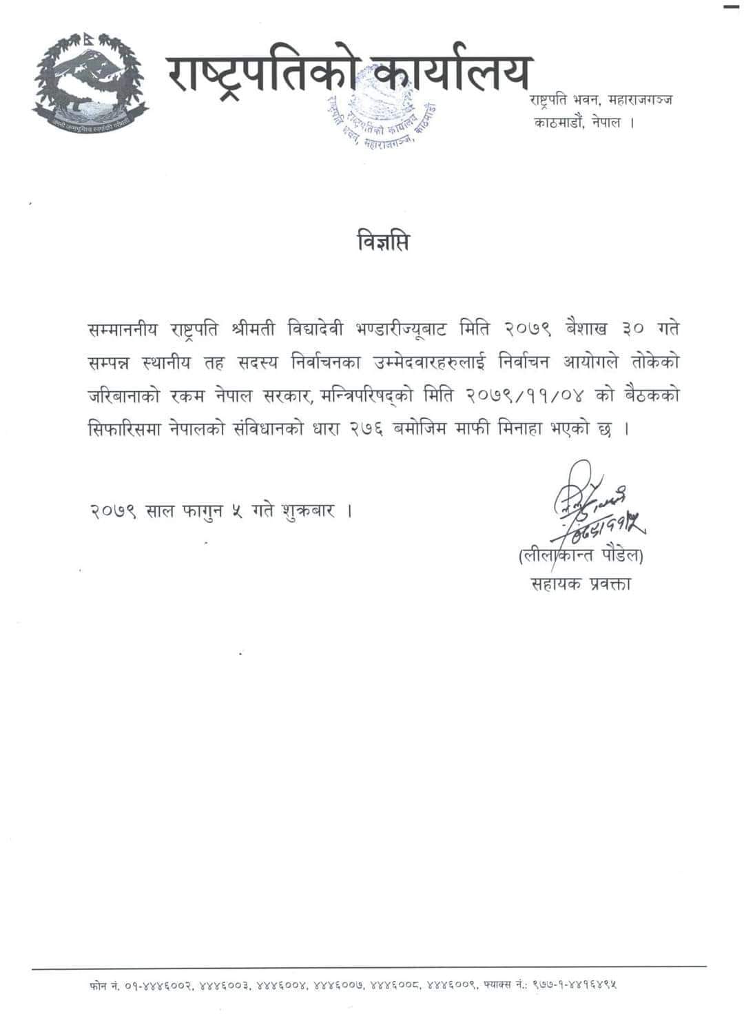 काठमाडौं । राष्ट्रपति विद्यादेवी भण्डारीबाट गत वैशाख ३० गते सम्पन्न स्थानीय तह सदस्य निर्वाचनका उम्मेदवारलाई निर्वाचन आयोगले तोकेको जरिवानाको रकम माफी मिनाहा भएको छ ।