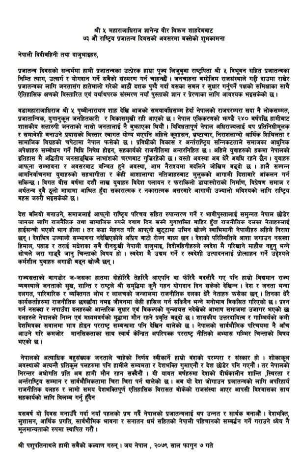 प्रजातन्त्र दिवसको पूर्वसन्ध्यामा अवसरमा शुभकामना सन्देश जारी गर्दै पूर्वराजा शाहले राजनीतिक दलका नेताहरु देश र जनता भन्दा दलगत, पारिवारिक र व्यक्तिगत लोभ र लालचको जञ्जालमा फसेको बताएका हुन् ।