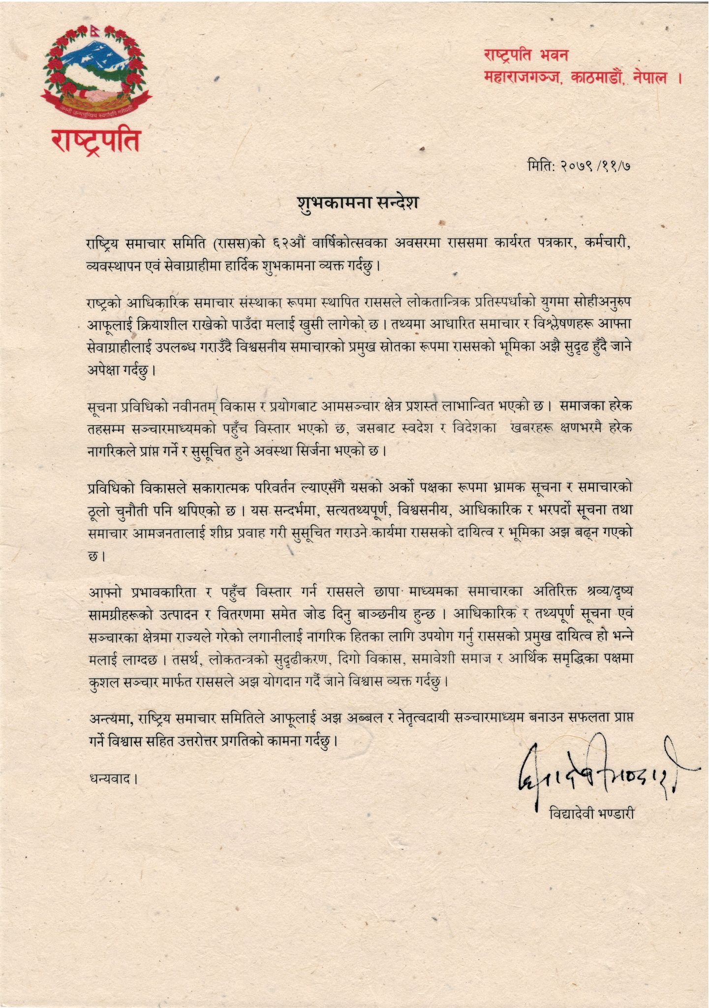 राष्ट्रिय समाचार समिति (रासस) को ६२औँ वार्षिकोत्सवका अवसरमा एक शुभकामना सन्देश दिँदै राष्ट्रपतिले राष्ट्रको आधिकारिक समाचार संस्थाका रूपमा स्थापित राससले लोकतान्त्रिक प्रतिस्पर्धाको युगमा सोहीअनुरुप आफूलाई क्रियाशील राखेको पाउँदा आफूलाई खुसी लागेको बताएकी छन् ।