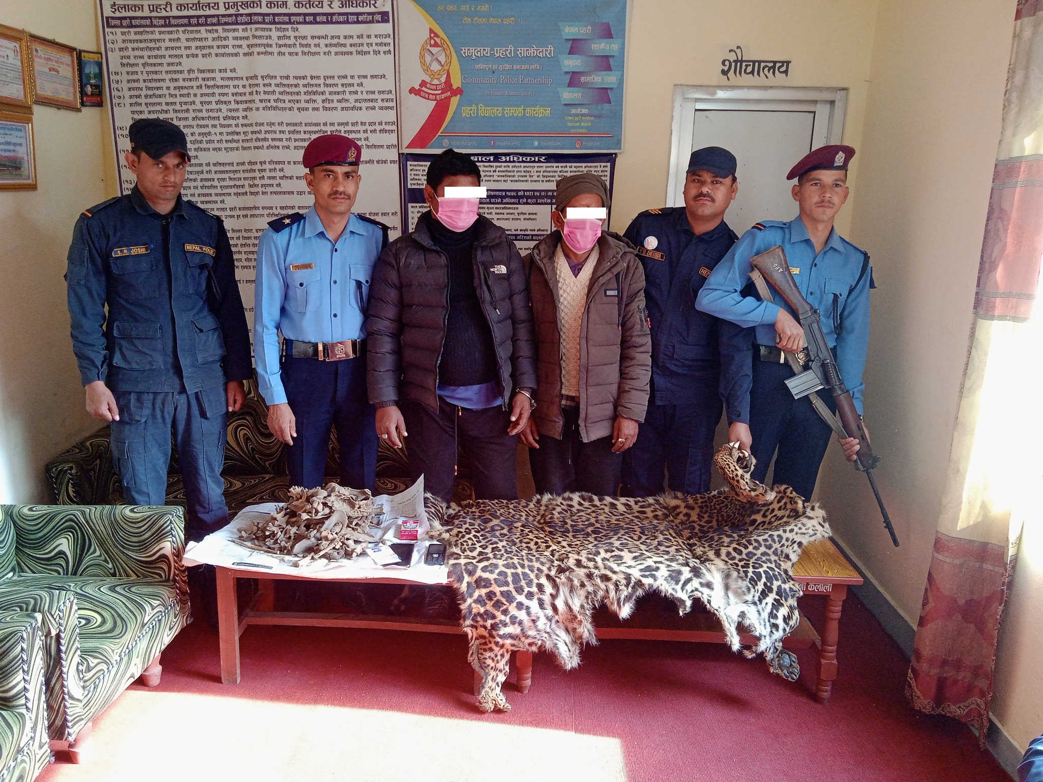 उनीहरुको साथबाट प्रहरीले ७ फिट १० इन्च लम्बाई र ४ फिट ७ इन्च चौडाइ भएको चितुवाको एक थान छाला र वन्यजन्तुका २ किलो ९५० ग्राम हड्डी बरामद गरेको हो । दुबै जनालाई नियन्त्रणमा लिएर थप अनुसन्धान भइरहेको प्रहरीले जनाएको छ ।