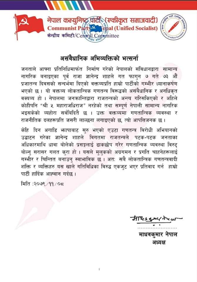 सोमबार एक विज्ञप्ति जारी गर्दै अध्यक्ष नेपालले जनताले आफ्ना प्रतिनिधिमार्फत निर्माण गरेको नेपालको संविधानद्वारा सामान्य नागरिक बनाइएका पूर्वराजा ज्ञानेन्द्र शाहको वक्तव्य असंवैधानिक र अनधिकृत भएको बताएका छन् ।
