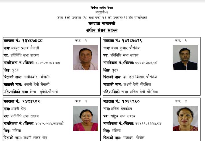 प्रतिनिधि सभा, राष्ट्रिय सभा र प्रदेश सभाका सांसदहरु मतदाता रहने राष्ट्रपति र उपराष्ट्रपति निर्वाचनमा प्रतिनिधि सभाका तीन जना सांसदले भने मत दिन नपाउने भएका छन् । निर्वाचन अधिकृतको कार्यालय नयाँ बानेश्वरले राष्ट्रपति निर्वाचनका लागि बुधबार नामावली सार्वजनिक गरेको हो ।