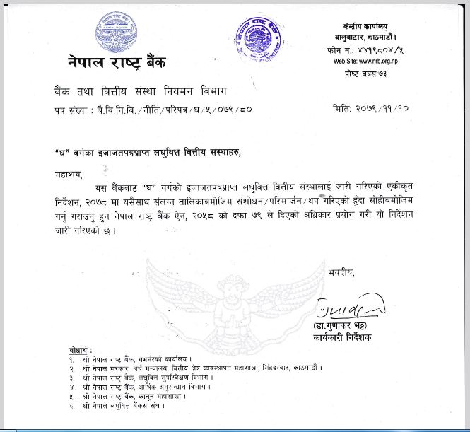 काठमाडौं । नेपाल राष्ट्र बैंकले लघुवित्तीय संस्थाहरुलाई जारी गरिएको एकीकृत निर्देशन, २०७८ मा संशोधन गरेको छ । राष्ट्र बैंकले बुधबार परिपत्र जारी गर्दे ‘घ’ वर्गका लघुवित्त संस्थाहरुमा कार्यान्वयनमा आउने गरी उक्त व्यवस्थालाई संशोधन गरेको हो ।