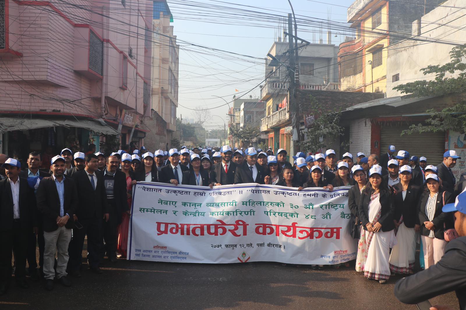 वीरगन्ज । कानुन व्यवसायी महिलाको ३० औँ राष्ट्रिय सम्मेलन आजदेखि पर्साको वीरगन्जमा शुरु हुँदैछ । त्यस अवसरमा आज बिहान यहाँ प्रभातफेरी गरिएको छ ।