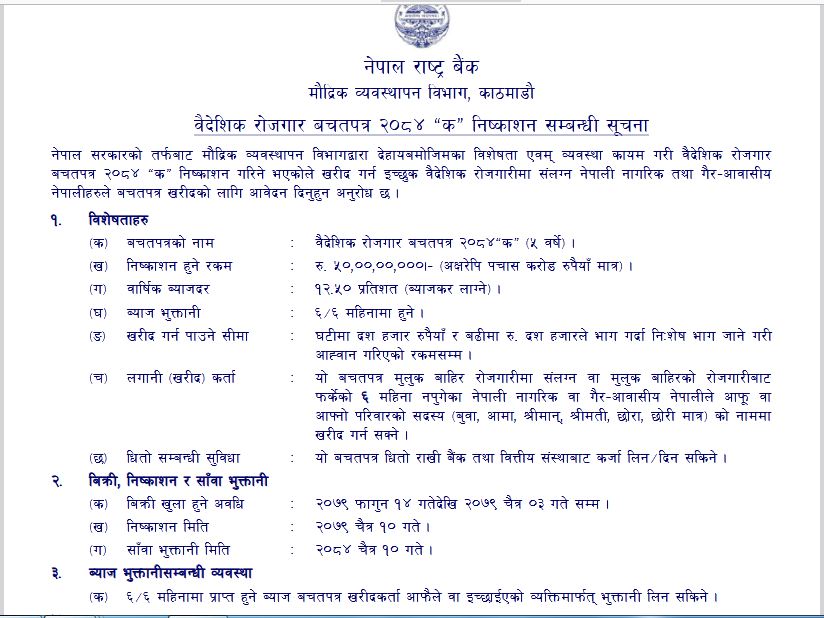 काठमाडौं । नेपाल राष्ट्र बैंकले फागुन १४ गतेबाट ५० करोड रुपैयाँ बराबरको बैदेशिक रोजगार बचतपत्रको बिक्री खुल्ला गर्ने भएको छ । राष्ट्र बैंकका अनुसार उक्त दिनबाट पाँच वर्षे अवधिको बैदेशिक रोजगार बचतपत्र ‘२०८४’ क (५ वर्षे) बिक्री गर्न लागिएको हो ।