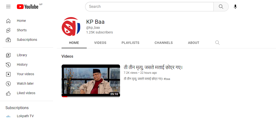 उनको युट्युब च्यानलमा ‘ती तीन मृत्यु, जसले मलाई छोडेर गए’ शीर्षकमा २५ मिनेटको भिडिओ अपलोड भएको छ । यो समाचार तयार पार्दासम्म ‘ओली बा’ युट्युब च्यानललाई १ हजार २५ जनाले सस्क्राइब गरेका छन् भने उनले २२ घण्टा अगाडी अपलोड गरेका भिडियोलाई ७ हजार २ सय जनाले हेरेका छन् ।