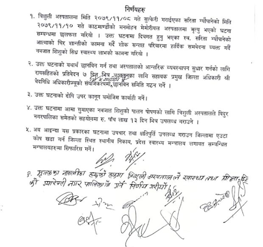त्यसको साथै उक्त घटनाको दोषी उपर कानून बमोजिम कारबाही गर्ने, ज्यान गुमाएकी नवजात शिशुको पालनपोषणको लागि त्रिशुली अस्पताल र विदुर नगरपालिका समेतको सहयोगमा ५ लाख १३ दिनभित्र उपलब्ध गराउने । त्यस्तै अबदेखि कुनै पनि घटनामा उपचार तथा क्षतीपूर्ती उपलब्ध गराउन जिल्लामा कोष खडा गर्ने । त्यसको लागि जिल्लास्थित स्थानीय निकाय, प्रदेश स्वास्थ्य मन्त्रालय लगायत सम्बन्धित मन्त्रालयहरुमा सिफारिस गर्ने निर्णय भएको हो ।