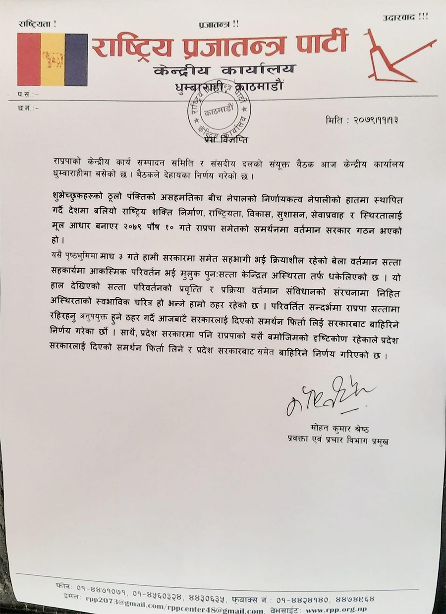 राप्रपाले वर्तमान सत्ता सहकार्यमा आकस्मिक परिवर्तन भई मुलुक पुनः सत्ता केन्द्रित अस्थिरता तर्फ धकेलिएको भन्दै सरकारबाट बाहिरिएको राप्रपाले जनाएको छ ।