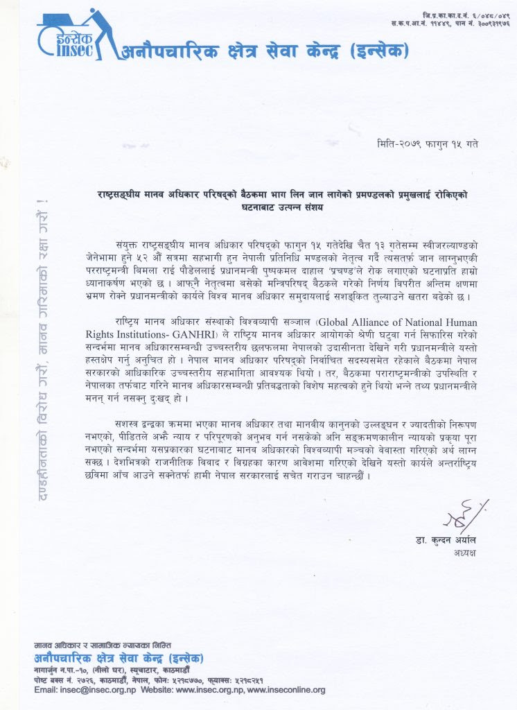इन्सेकका अध्यक्ष डा. कुन्दन अर्यालद्वारा फागुन १५ गते जारी विज्ञप्तिमा आफ्नै नेतृत्वमा बसेको मन्त्रिपरिषद् बैठकले गरेको निर्णय विपरीत अन्तिम क्षणमा भ्रमण रोक्ने प्रधानमन्त्रीको कार्यले विश्व मानव अधिकार समुदायलाई सशङ्कित तुल्याउने खतरा बढेको उल्लेख छ ।