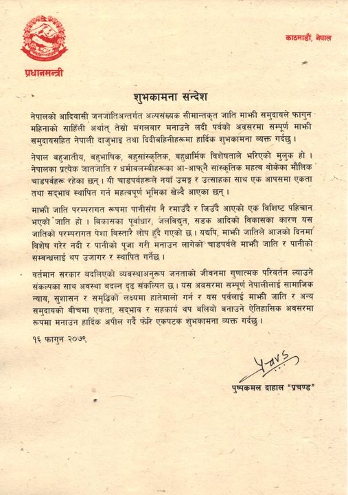 ‘माझी जातिले आजको दिनमा विशेष गरेर नदी र पानीको पूजा गरी मनाउन लागेको चाडपर्वले माझी जाति र पानीको सम्बन्धलाई थप उजागर र स्थापित गर्नेछ’, प्रधानमन्त्रीले सन्देशमा भनेका छन् ।