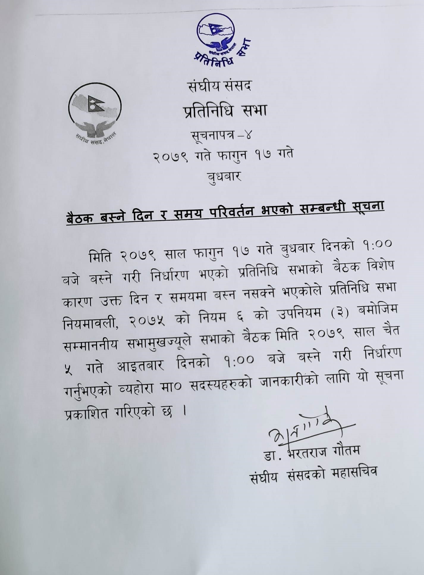 प्रतिनिधि सभा नियमावली २०७५ को नियम ६ को उपनियम (३) बमोजिम सभामुख देवराज घिमिरेले अर्काे बैठक आगामी चैत ५ गते बस्ने गरि निर्धारण गरिएको जनाइएको छ ।