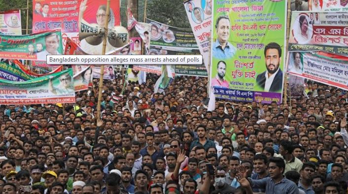 तेस्रो कार्यकाल सम्पन्न गरिसकेकी प्रधानमन्त्री हसिनाले चौथो कार्यकाल जितेर कीर्तिमानी कायम गर्ने लक्ष्यसाथ निर्वाचनमा आफ्ना सक्रिय कार्यकर्ता तथा समर्थकहरूलाई विभिन्न आरोपमा प्रहरी हिरासतमा लिएको आरोप बङ्गलादेश नेशनालिस्ट पार्टी (बिएनपी) ले लगाएको छ ।