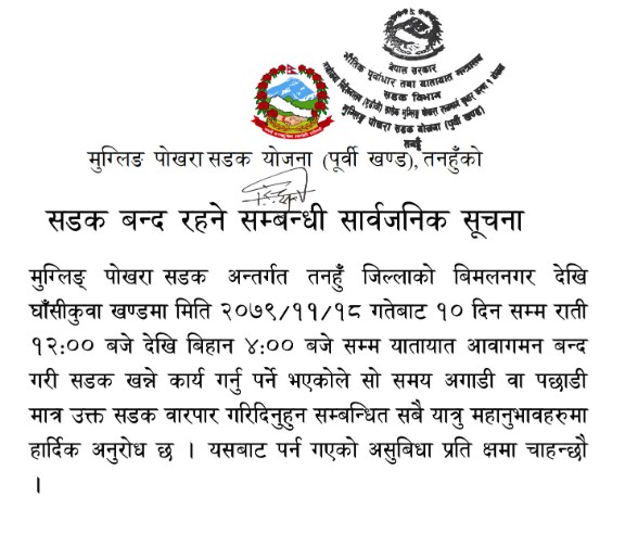 मुग्लिन पोखरा सडकखण्डको विस्तार कार्यअन्तर्गत उक्त खण्डमा सुरक्षितरुपमा काम गर्नका लागि आज राति १२ बजेदेखि बिहान ४ बजेसम्म उक्त खण्ड बन्द हुने सहायक प्रमुख जिल्ला अधिकारी काशीराम गैह्रेले जानकारी दिए । उक्त खण्डमा अत्यावश्यक सवारी साधनबाहेक अन्य सवारी साधन पूर्णरुपमा बन्द गरी काम गरिने मुग्लिन पोखरा सडक योजना (पूर्वी) खण्डले जनाएको छ ।