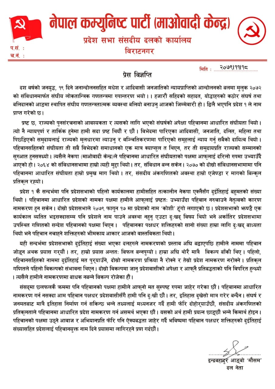 संघर्ष र जनमतबाट मात्रै इतिहास निर्माण गर्न सकिन्छ भन्ने तथ्यलाई मध्यनजर गर्दै हामी फेरि दोहोर्याउँछौँ, संसदीय अंकगणीतको प्रतिकुलताले पहिचानमा आधारित प्रदेश नामाकरण गर्न असमर्थ भएका छौँ ।’ जारी विज्ञप्तिमा भनिएको छ । त्यस्तै भोलिका दिनमा संसदीय अंकगणीत पुर्याएर पहिचानसहितको प्रदेशको नामाकरणमा लागि पर्ने अडान कायम रहेको समेत उनले बताए ।