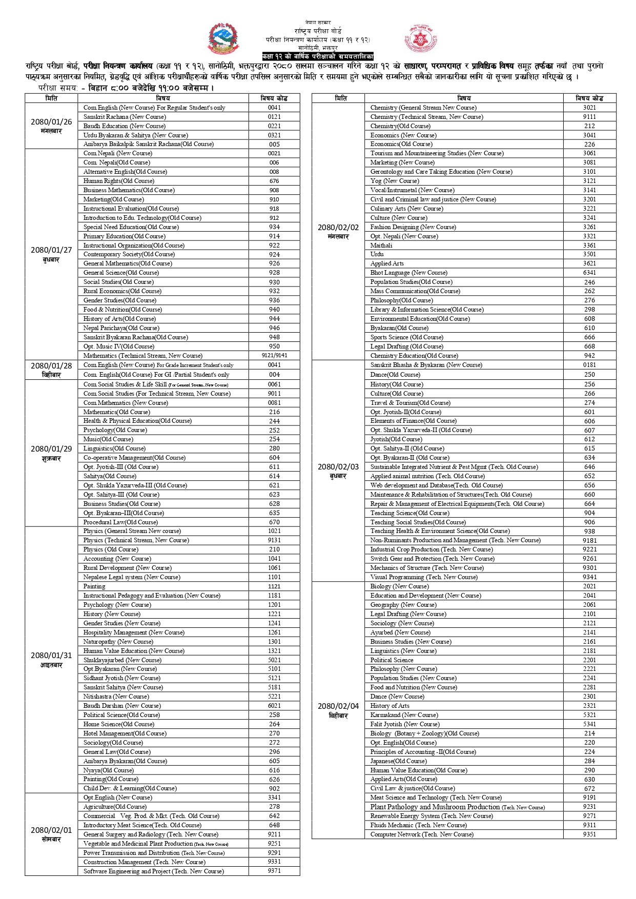 बोर्डले सार्वजनिक गरेको तालिकाअनुसार २०८० साल वैशाख २६ गतेबाट परीक्षा शुरु हुने जनाइएको छ । पहिलो दिन अनिवार्य अंग्रेजी, संस्कृत रचना, वौद्ध शिक्षा, उर्दु व्याकरण र साहित्य, अनिवार्य वैकल्पिक संस्कृत रचना लगायतका विषय रहेको परीक्षा हुनेछ ।