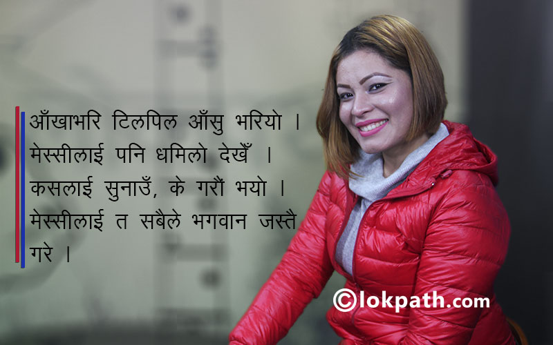 ‘अरु खेलाडी छिर्दासम्म सामान्य देखिएको स्टेडियमको वातावरण मेस्सी छिर्नासाथ एकाएक हौसियो । सबैजनाले एउटै शब्द मात्र दो-याइरहेका थिए ‘मेस्सी’ । मेरो आँखाभरि आँसु थियो त्यसैले मेस्सीलाई पनि धमिलो देखेँ । कसलाई सुनाउँ, के गरौं भयो तर, छेउमा कोही थिएन । एक्लै गएकी थिएँ । त्यो फिलिङ म बयान गर्नै सक्दिन । ड्रिम कम ट्रु ।’