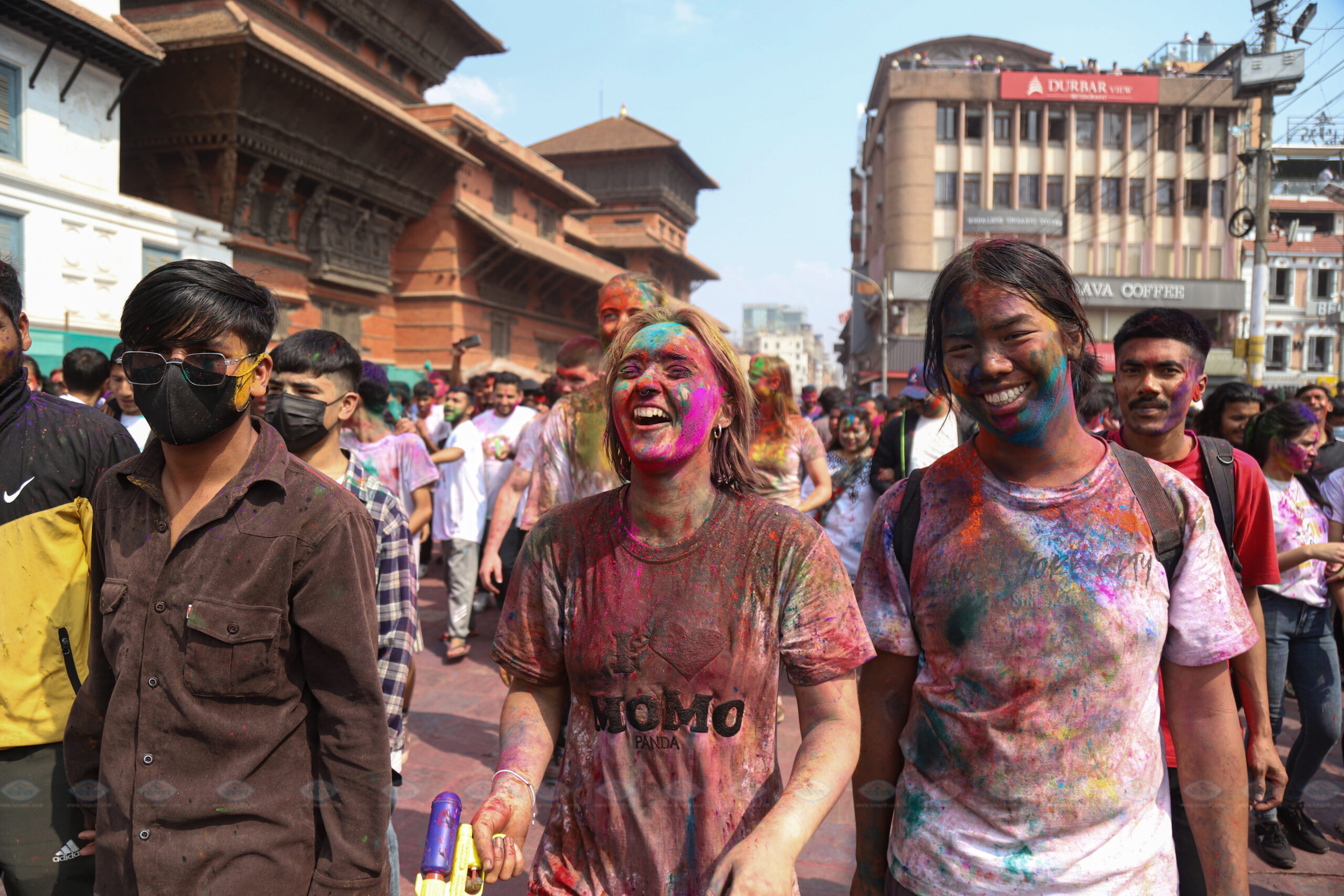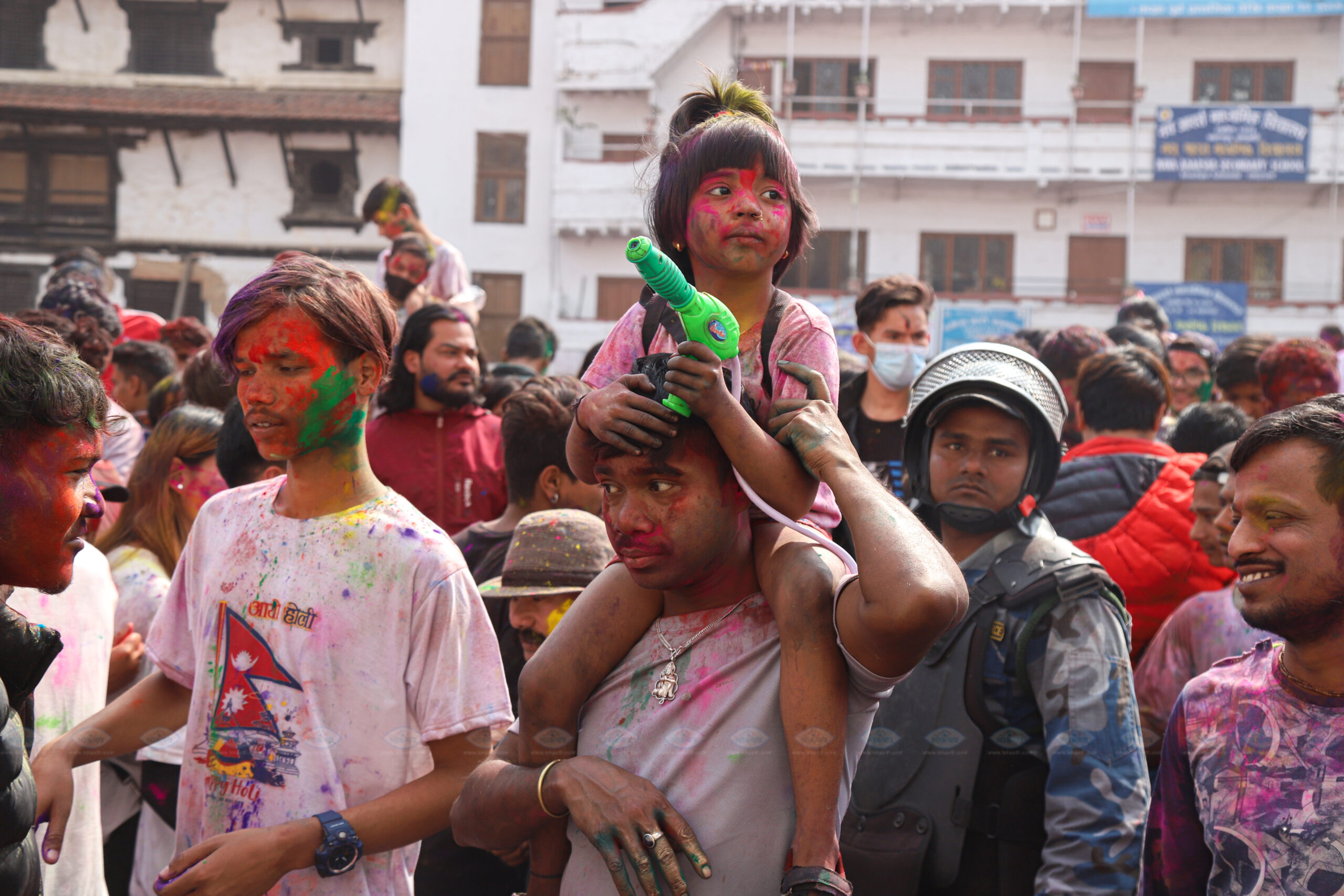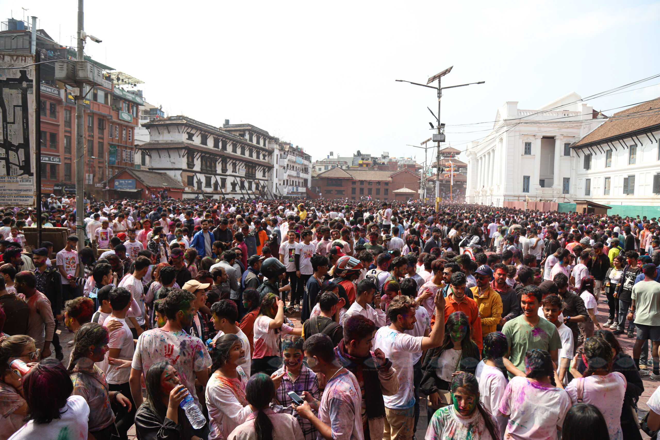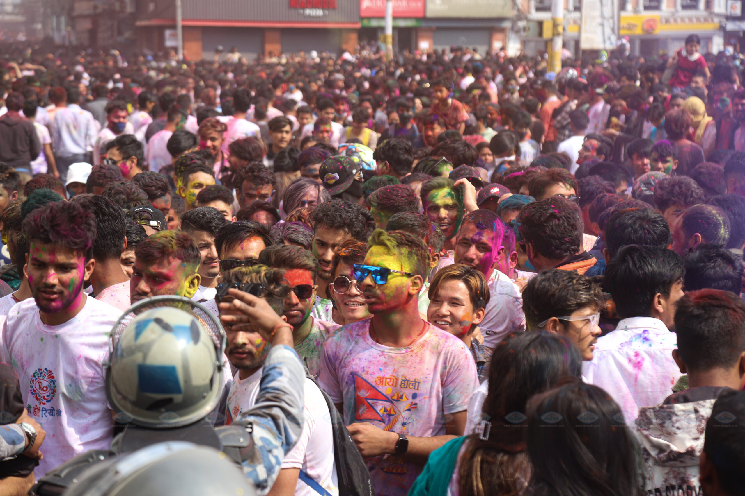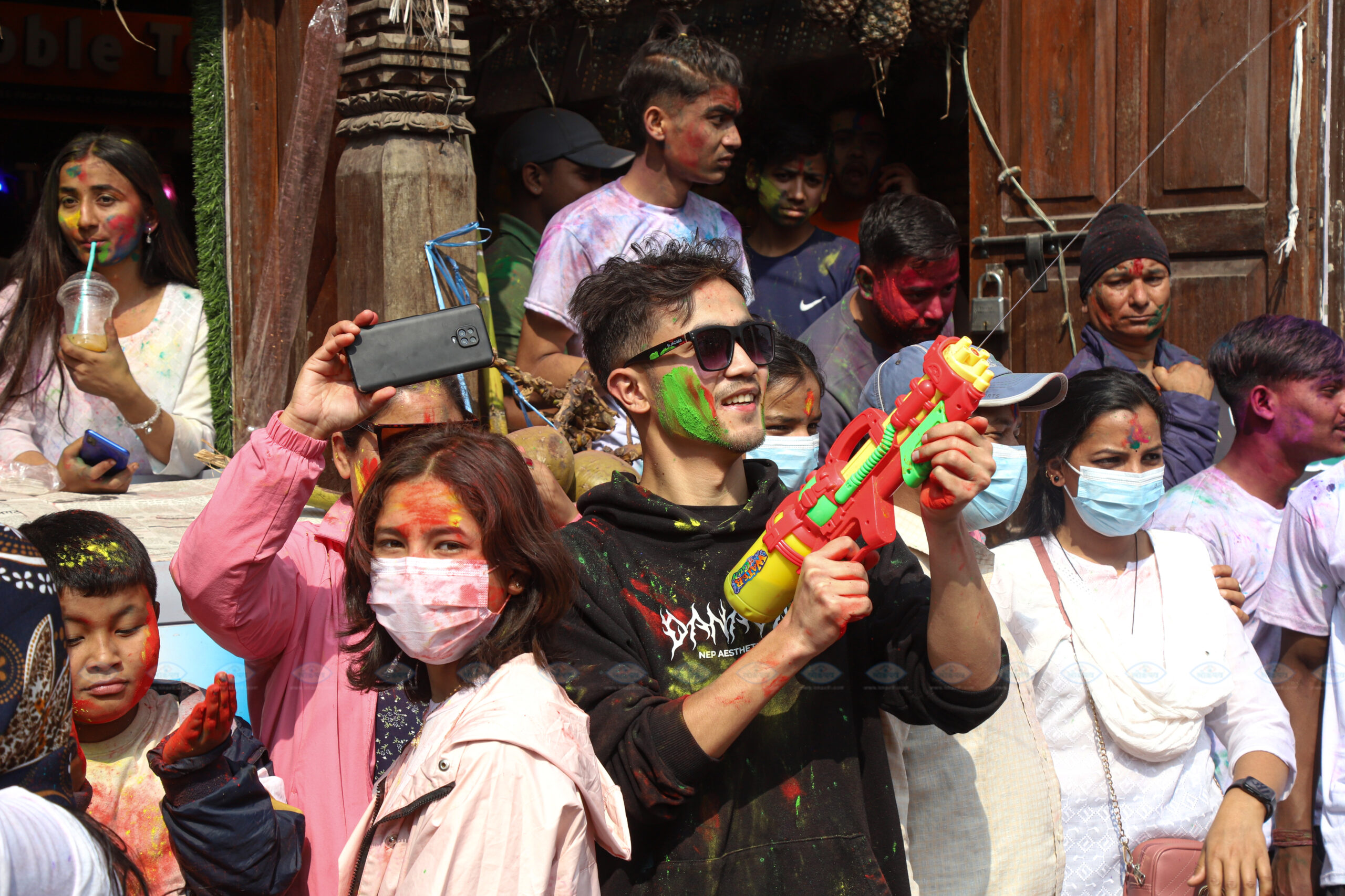 सो क्रममा काठमाडौंको वसन्तपुरमा होली खेल्नेहरुको ठूलो भिड लागेको थियो । नेपाल घुम्न आएका पर्यटकहरु समेत होलीको रौनकमा रमाएका छन् ।