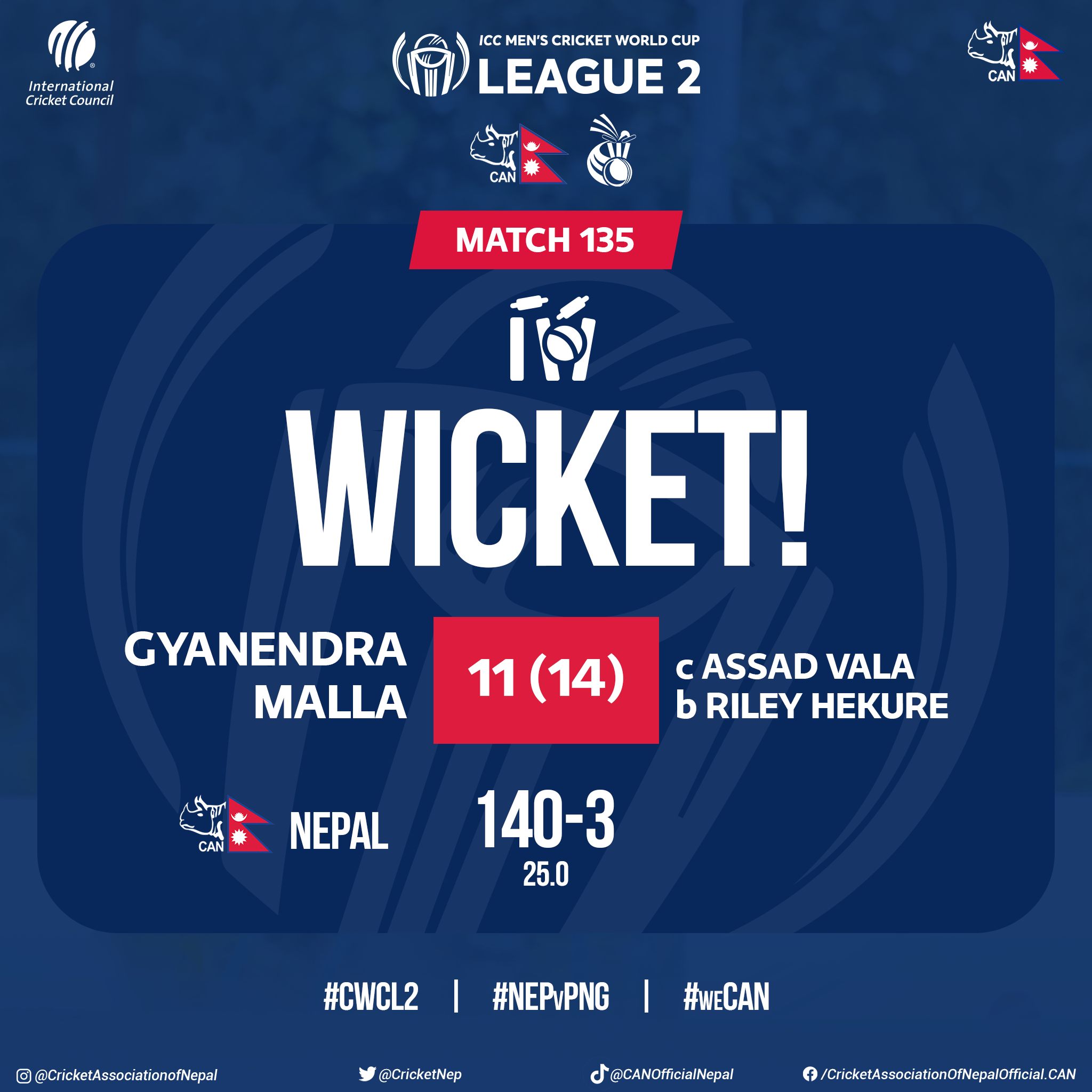 २५औं ओभरको अन्तिम बलमा ज्ञानेन्द्र मल्ल ११ रन बनाएर आउट भए ।