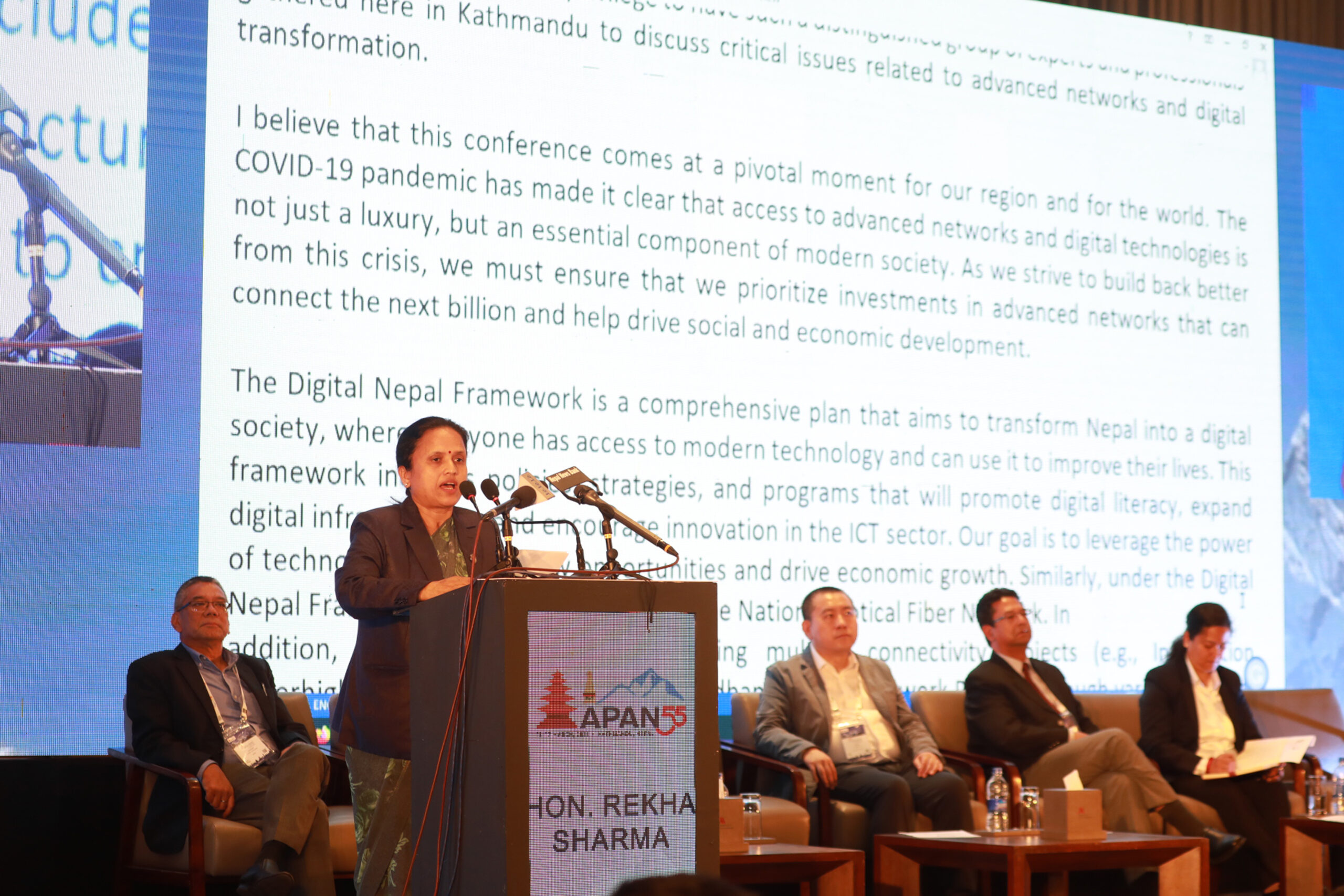 राजधानीमा आजदेखि सुरु भएको एशिया–प्यासिफिक एड्भान्स नेटवर्क (एपान)को ५५औँ अन्तर्राष्ट्रिय सम्मेलनलाई सम्बोधन गर्दै उनले सरकारले आफ्नै भू–उपग्रह र सफ्टवेयर निर्माणको पहल थालेको र त्यसका लागि उपलब्ध स्रोतसाधनको उच्चतम प्रयोग र थप लगानी प्राथमिकतामा राखेको बताइन् ।