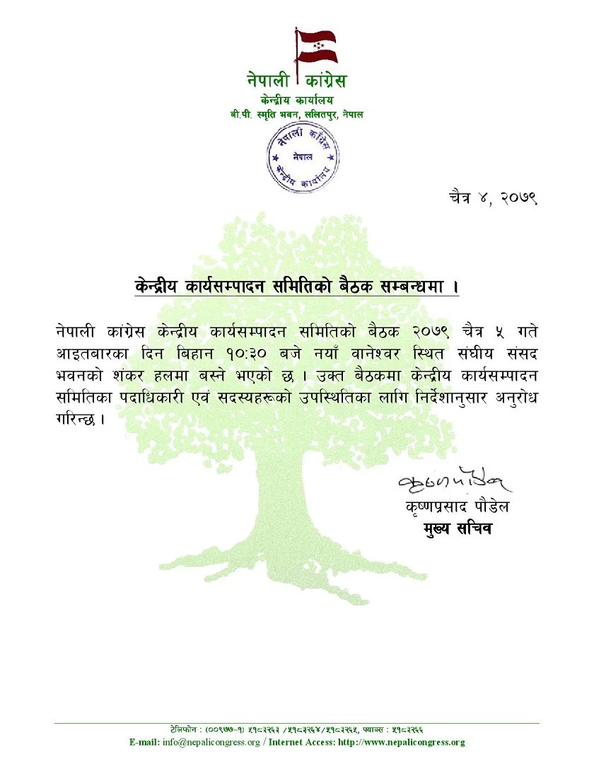 नयाँ बानेश्वरस्थित संघीय संसद भवनको शंकर हलमा आइतबार बिहान १०ः३० बजे बस्ने गरी कांग्रेसले केन्द्रीय कार्य सम्पादन समितिको बैठक बोलाएको हो ।