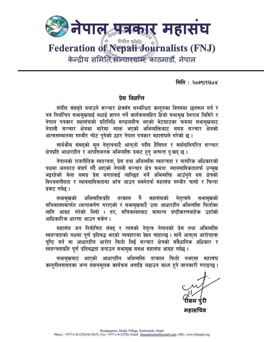 महासंघको प्रतिनिधि मण्डलबीच भएको भेटघाटका क्रममा सभामुखबाट नेपाली सञ्चार क्षेत्रका बारेमा व्यक्त भएको अभिव्यक्ति पदीय हैसियत र मर्यादाविपरित रहेको नेपाल पत्रकार महासंघले ठहर गरेको छ ।