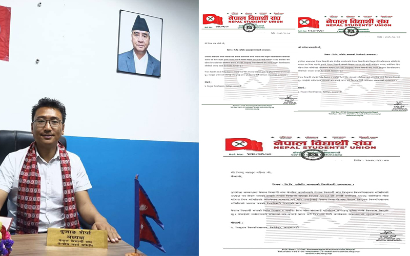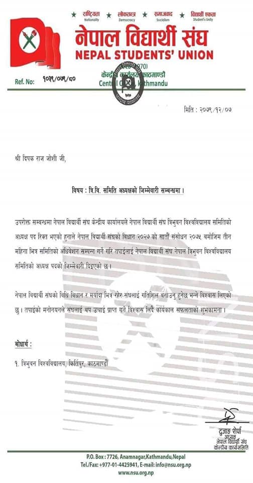 काठमाडौं । नेपाल विद्यार्थी संघका अध्यक्ष दुजाङ शेर्पाले त्रिभुवन विश्वविद्यालय केन्द्रीय क्याम्पसको इकाइ अध्यक्षमा ३ जनालाई मनोनित गरेको पत्र सार्वजनिक भएको छ ।