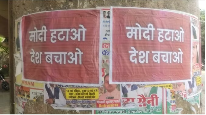 दिल्लीका केही भागमा ‘मोदी हटाओ, देश बचाओ’ लेखिएका पोस्टर टाँसिएका छन् । उजुरीका आधारमा छ जनालाई पक्राउ गरिएको दिल्ली प्रहरी प्रमुखले बताएका छन् । पोस्टरमा छापाखाना वा प्रकाशकको नाम उल्लेख गरिएको छैन । दिल्ली प्रहरीले घटनाको अनुसन्धान शुरु गरेको छ ।