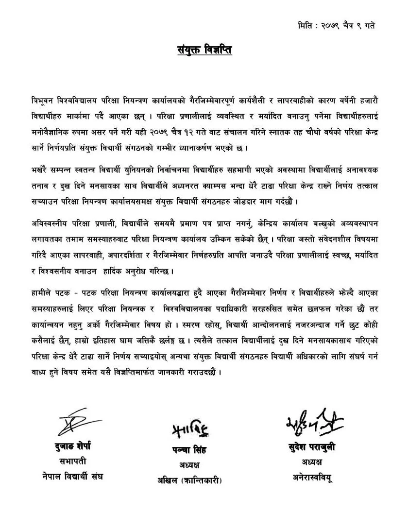 परीक्षा प्रणालीलाई व्यवस्थित र मर्यादित बनाउनुपर्नेमा विद्यार्थीहरुलाई मनोवैज्ञानिक रुपमा असर पर्ने गरी यही २०७९ चैत्र १२ गतेबाट सञ्चालन गरिने स्नातक चौथो वर्षको परीक्षा केन्द्र सार्ने निर्णप्रति संयुक्त विद्यार्थी संगठनको गम्भीर ध्यानाकर्षण भएको छ ।’ जारी विज्ञप्तिमा भनिएको छ, ‘विद्यार्थीहरुलाई अनावश्यक तनाव र दुख दिने मनसायका साथ विद्यार्थी)ंले अध्ययरत क्याम्पस भन्दा धेरै टाढा परीक्षा केन्द्र राख्ने निर्णय तत्काल सच्याउन परीक्षा नियन्त्रण कार्यालय समक्ष संयुक्त विद्यार्थी संगठनहरु जोडदार माग गर्दैछौँ ।’