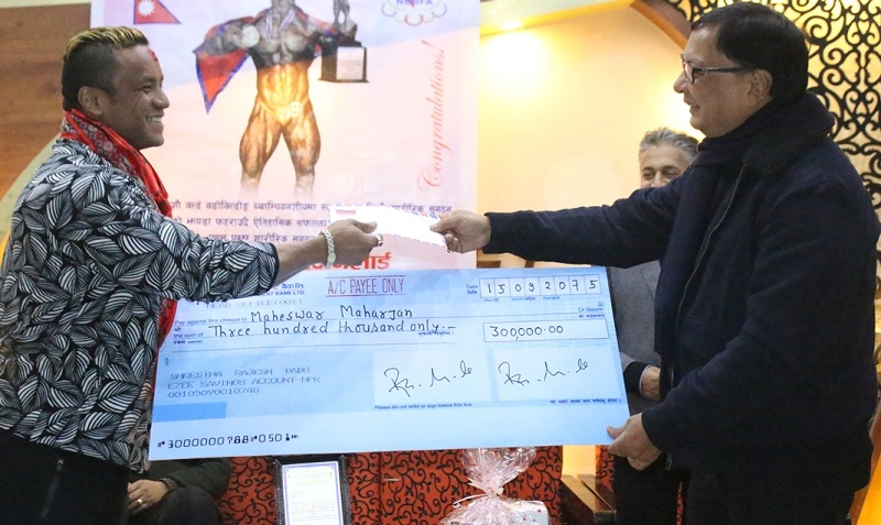 नेपाल शारीरिक सुगठन तथा फिट्नेस संघका अध्यक्ष राजेशबाबु श्रेष्ठले पूर्व घोषित नगद पुरस्कार ३ लाख रुपैयाँ प्रदान गरी महेश्वरलाई सम्मान गरेका हुन् ।