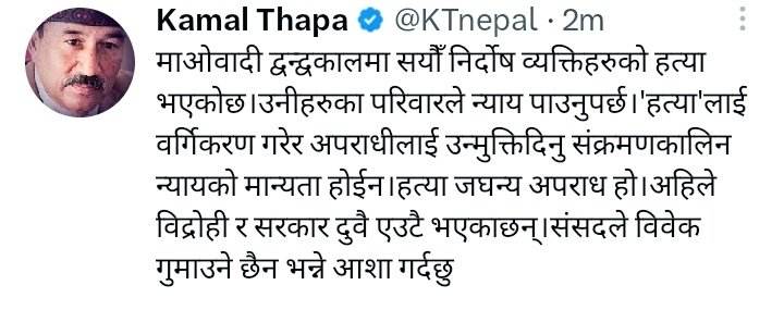 अध्यक्ष थापाले लेखेका छन् ‘माओवादी हिंसात्मक द्वन्द्वकालमा सयौँ निर्दोष व्यक्तिहरुको हत्या भएकोछ। उनीहरुका परिवारले न्याय पाउनुपर्छ। हत्याुलाई वर्गिकरण गरेर अपराधीलाई उन्मुक्तिदिनु संक्रमणकालिन न्यायको मान्यता होईन।हत्या जघन्य अपराध हो। अहिले विद्रोही र सरकार दुवै एउटै भएकाछन्। यस्तो बेला जनताको प्रतिनिधि संसदले विवेक गुमाउने छैन भन्ने आशा गर्दछु ।’