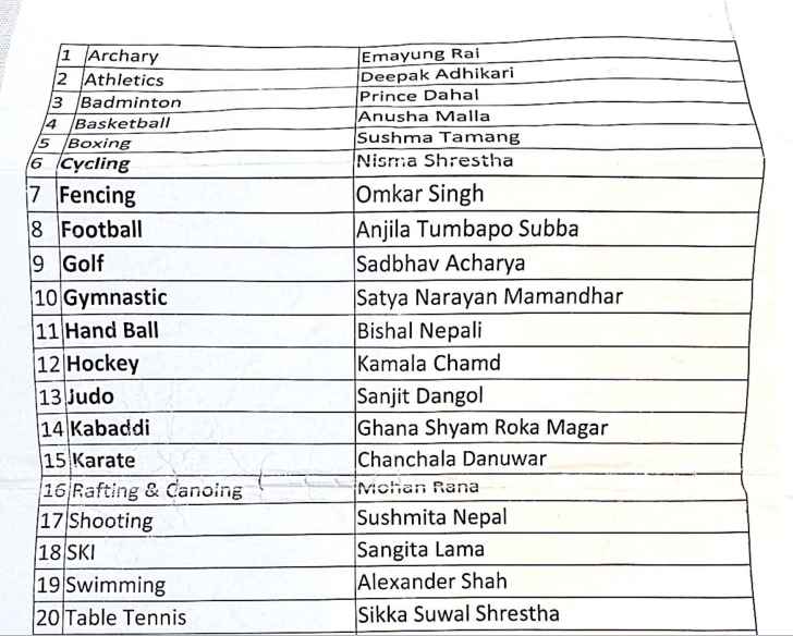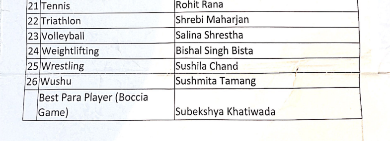 यो पटक फुटबल, एथलेटिक्स, ह्यान्डबल, गल्फ, उसु, भारोत्तोलन, सुटिङ, जुडो, ब्याडमिन्टन, आर्चरी, टेबलटेनिस, बक्सिङ, साइक्लिङ, फेन्सिङ, जिम्न्यास्टिक, हक्की, स्वीमिङ, ट्रायथोलन, स्की, कुस्ती, बास्केटबल, कबड्डी, कराते, र्याफ्टिङ, भलिबल, तेक्वान्दो र लनटेनिसका खेलाडी सम्मानित भएका छन् ।