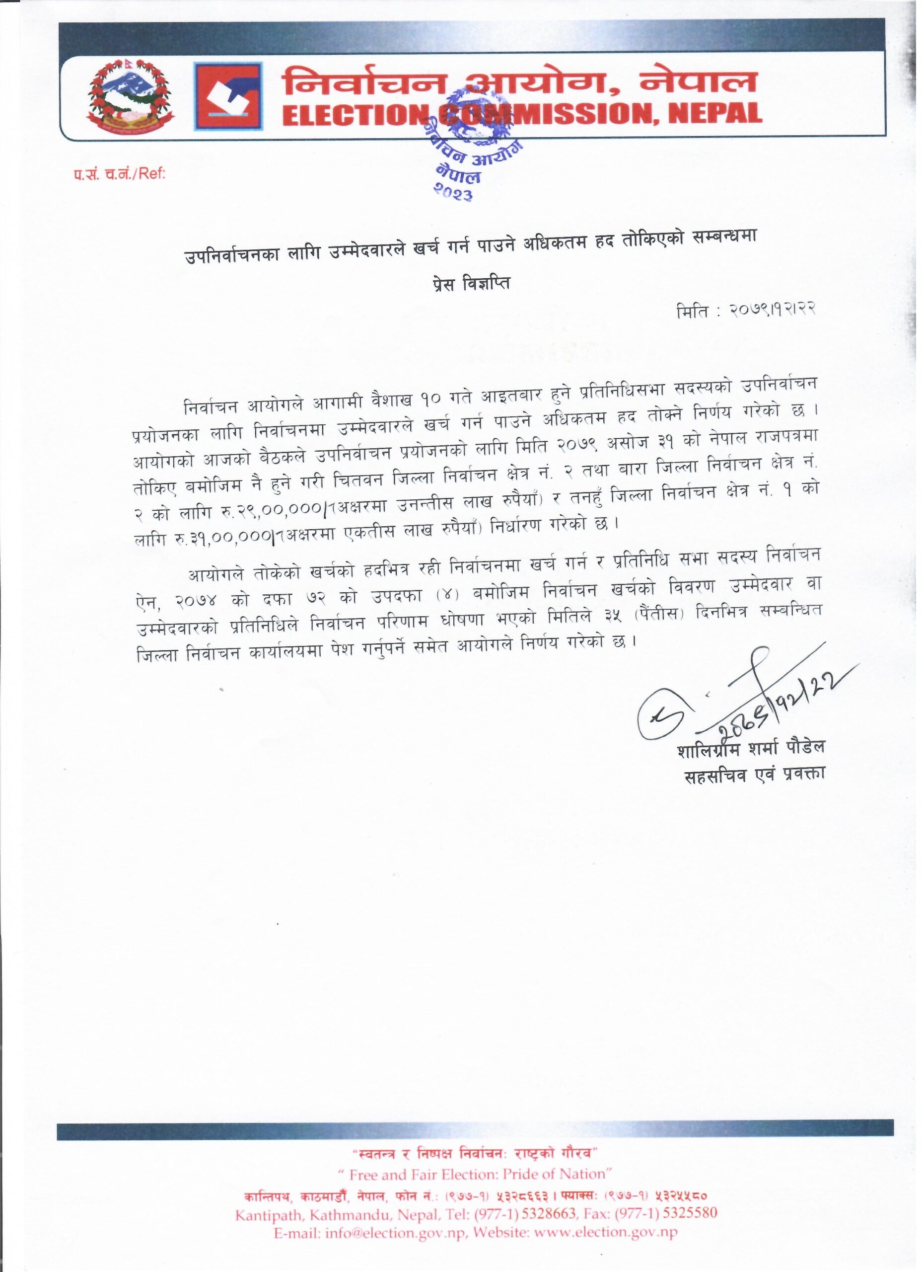 आयोगले तोकेको खर्चको हदभित्र रही निर्वाचनमा खर्च गर्न र प्रतिनिधिसभा सदस्य निर्वाचन ऐन, २०७४ को दफा ७२ को उपदफा (४) बमोजिम निर्वाचन खर्चको विवरण उम्मेदवार वा उम्मेदवारका प्रतिनिधिमार्फत निर्वाचन परिणाम घोषणा भएको मितिले पैँतीस दिनभित्र सम्बन्धित जिल्ला निर्वाचन कार्यालयमा पेस गर्नसमेत आयोगले भनेको छ ।