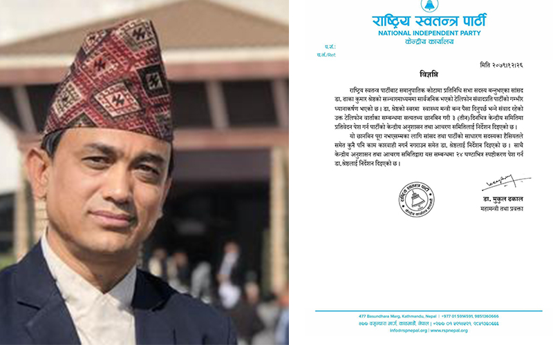 काठमाडौं । राष्ट्रिय स्वतन्त्र पार्टीका सांसद ढाकाकुमार श्रेष्ठ निलम्बनमा परेका छन् ।