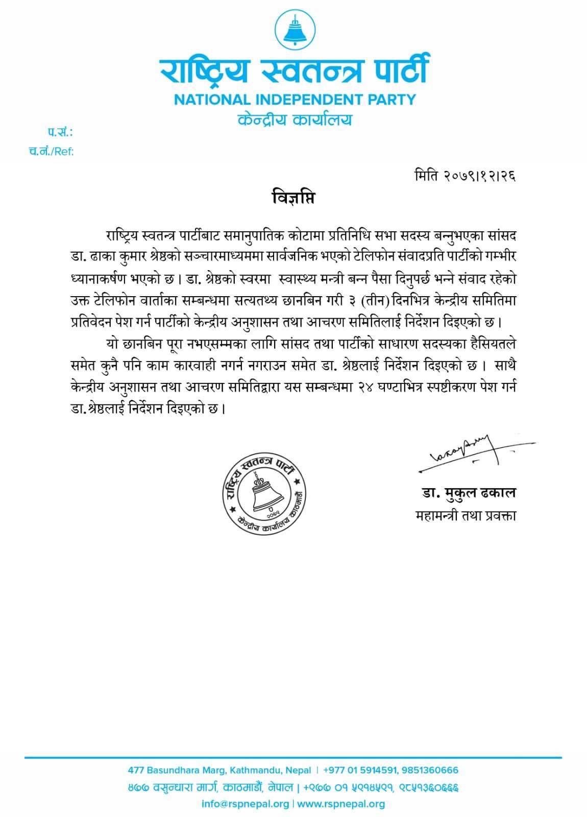 ‘डा. श्रेष्ठ (ढाकाकुमार) को स्वरमा स्वास्थ्यमन्त्री बन्न पैसा दिनुपर्छ भन्ने संवाद रहेको प्रतिवेदन पेश गर्न पार्टीको केन्द्रीय अनुशासन तथा आचरण समितिलाई दिर्नेशन दिइएको छ ।’ जारी विज्ञप्तिमा भनिएको छ, ‘यो छानबिन पूरा नभएसम्मका लागि सांसद तथा पार्टीको साधारण सदस्यको हैसियतले समेत कुनै पनि काम कारबाही नगर्न नगराउन समेत डा. श्रेष्ठलाई निर्देशन दिइएको छ ।’