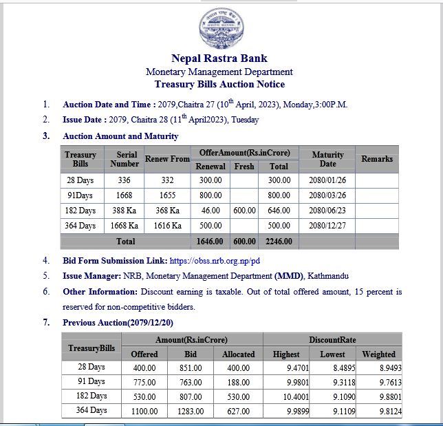 राष्ट्र बैंकका अनुसार यि ट्रेजरीहरुको परिपक्व हुने अवधि भने क्रमशः २०८० बैशाख २६ गते, २०८०, असार २६ गते, २०८० असोज २३ गते र २०८० चैत २७ गते तोकिएका छन् । यि ट्रेजरी बिलहरुमा एक सय ८२ दिने अवधिको छ अर्ब रुपैंयाँ बराबरको टे«जरी बिल नयाँ भएपनि बाँकी भने पुरानो नविकरण अन्र्तगतका रहेका छन् ।