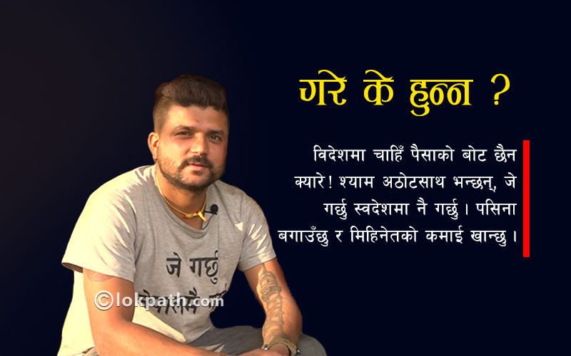 श्याम ठेलामा तरकारी बेच्दै हिड्छन् भने उनकी श्रीमतीले मासु पसल राखेकी छन् । यि दुईको कमाईले घरखर्चमात्र चलेको होइन बचतपनि हुने गरेको छ । विदेशमा मात्र कामको सम्भावना र नेपालमा काम गर्ने वातावरण छैन । अनी नेपालमा काम गर्दा कामलाई सानो र ठूलो भन्नेहरुले श्यामबाट केही सिक्ने की ?