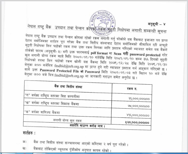 यसरी मुुद्धती निक्षेपको रुपमा राखिने कुुल रकम मध्येमा वाणिज्य बैकहरुको लागि ४१ करोड ६० लाख, बिकास बैंकहरुको लागि सात करोड ८० लाख र फाईनान्स कम्पनीहरुको लागि दुई करोड ६० लाख रुपैयाँ छुुट्याईएको छ । राष्ट्र बैकका अनुसार रकम लगानी गर्न चाहाने इच्छुुक तथा फाईनान्स कम्पनीहरुले यही चैत ३० गतेसम्म नेपाल राष्ट्र बैंकमा आफुुले लगानी गर्न चाहेको रकम र उक्त रकममा दिन चाहेको व्याज समेत उल्लेख गरेर आवेदन दिनुुपर्ने छ ।