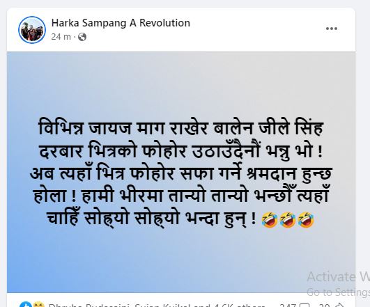 ‘विभिन्न जायज माग राखेर बालेन जीले सिंह दरबार भित्रको फोहोर उठाउँदैनौं भन्नु भो ! अब त्यहाँ भित्र फोहोर सफा गर्ने श्रमदान हुन्छ होला ! हामी भीरमा तान्यो तान्यो भन्छौँ त्यहाँ चाहिँ सोह्र्यो सोह्र्यो भन्दा हुन् !’ उनले भनेका छन् ।