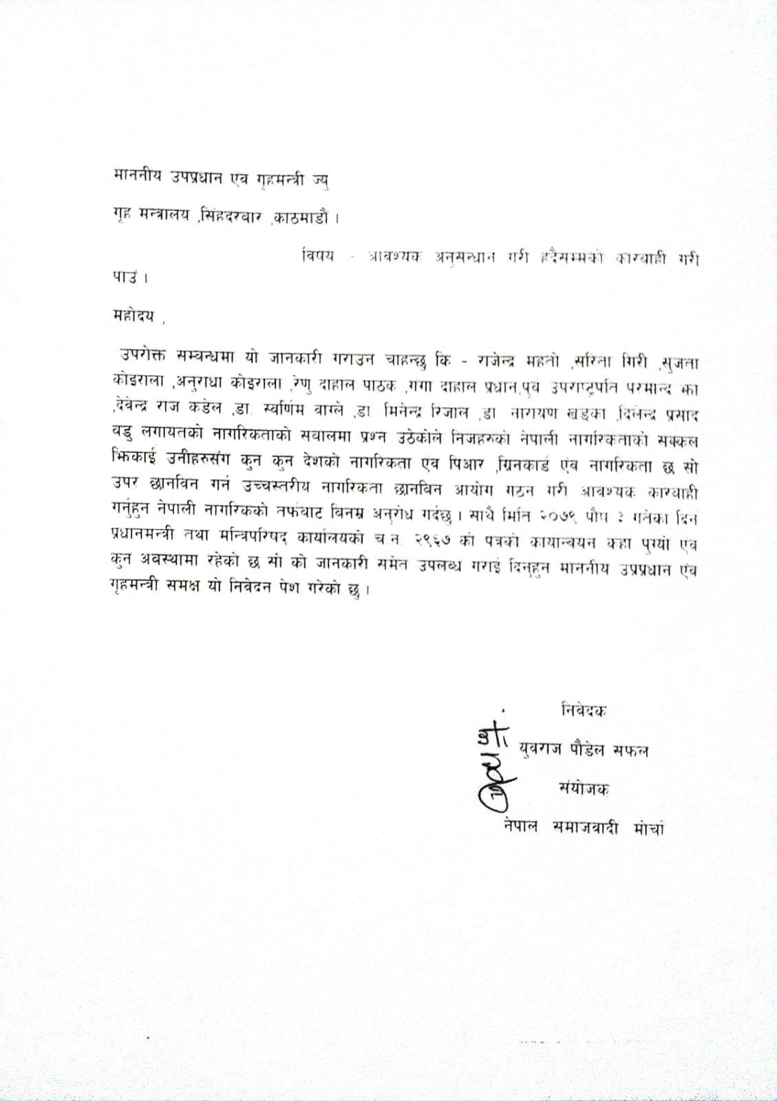 नेपाल समाजवादी मोर्चाका संयोजक युवराज पौडेल सफलले नेपालका विभिन्न पार्टीमा रहेका नेताहरूको नागरिकताबारे प्रश्न उठेकोले आवश्यक छानबिनको माग गर्दै गृह मन्त्रालयमा निवेदन दिएका हुन् ।