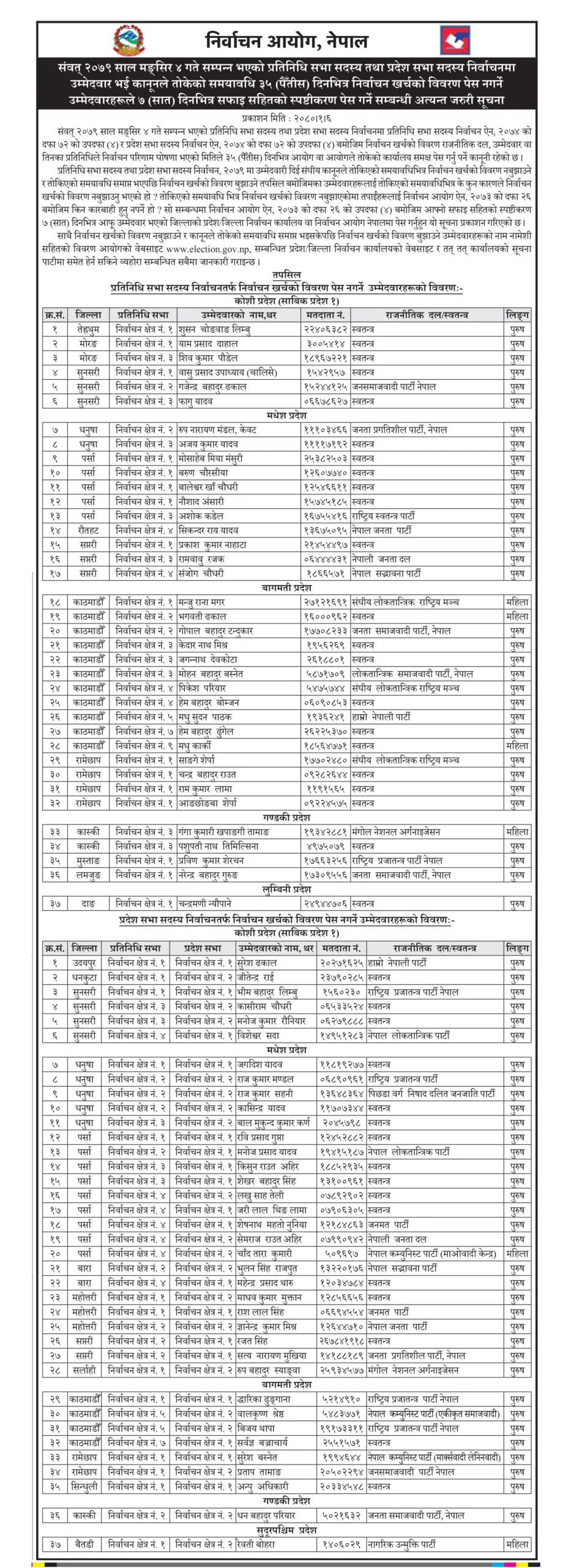 निर्वाचनको अन्तिम परिणाम प्रकाशित भएको मितिले ३५ दिनभित्र निर्वाचन खर्चको विवरण पेस गर्ने प्रतिनिधिसभाका सदस्य दुई हजार तीन सय ७३ र प्रदेशसभा सदस्य निर्वाचनका तीन हजार एक सय ८८ उम्मेदवारसहित पाँच हजार पाँच सय ६१ उम्मेदवारलाई निर्वाचन (कसुर तथा सजाय) ऐन, २०७३ को अनुसार सो निर्देशन दिइएको हो ।