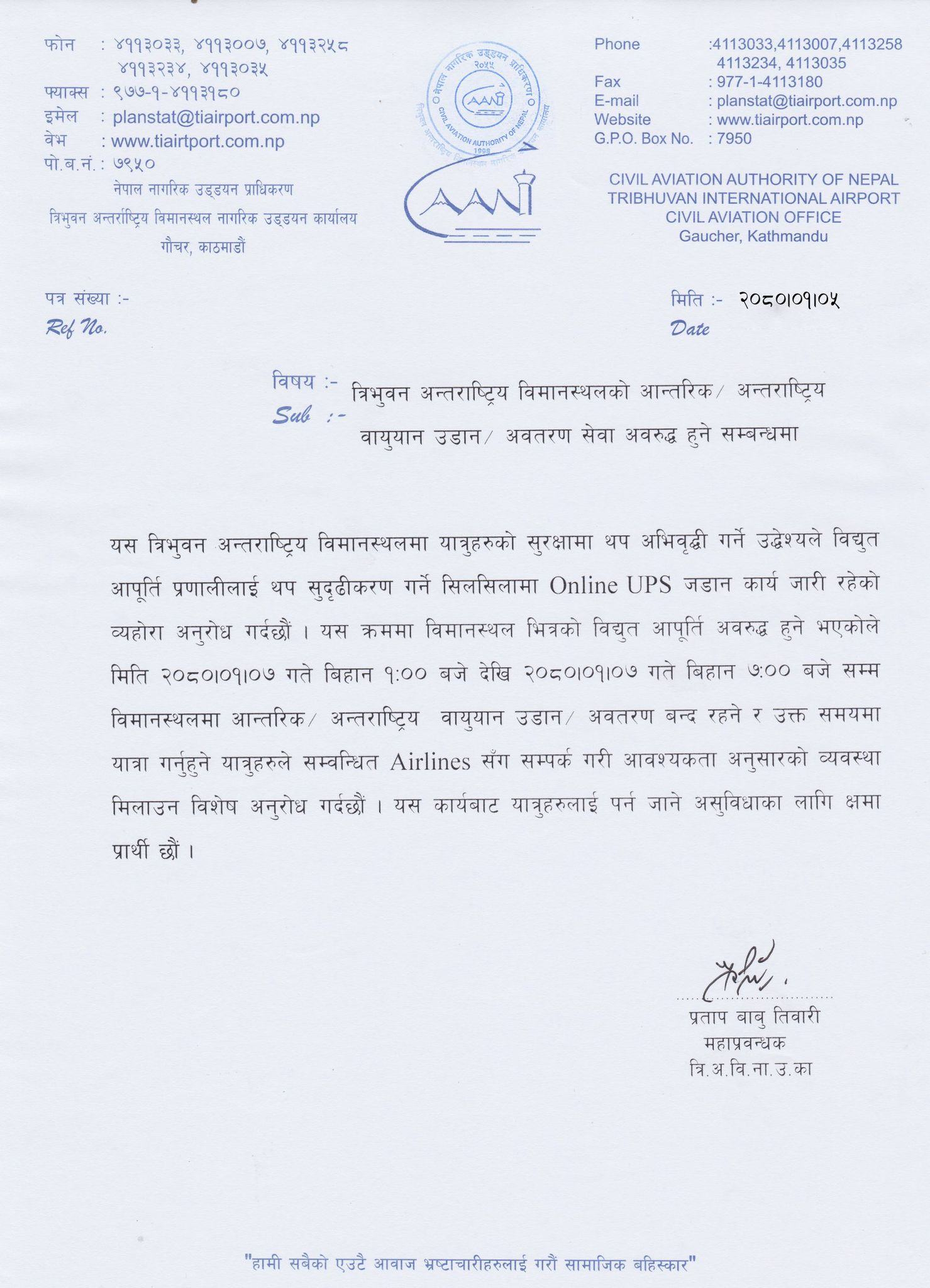विमानस्थलमा अनलाइन यूपीएस जडान गर्ने काम जारी रहेका कारण उडान अवरुद्ध हुने भएको हो ।