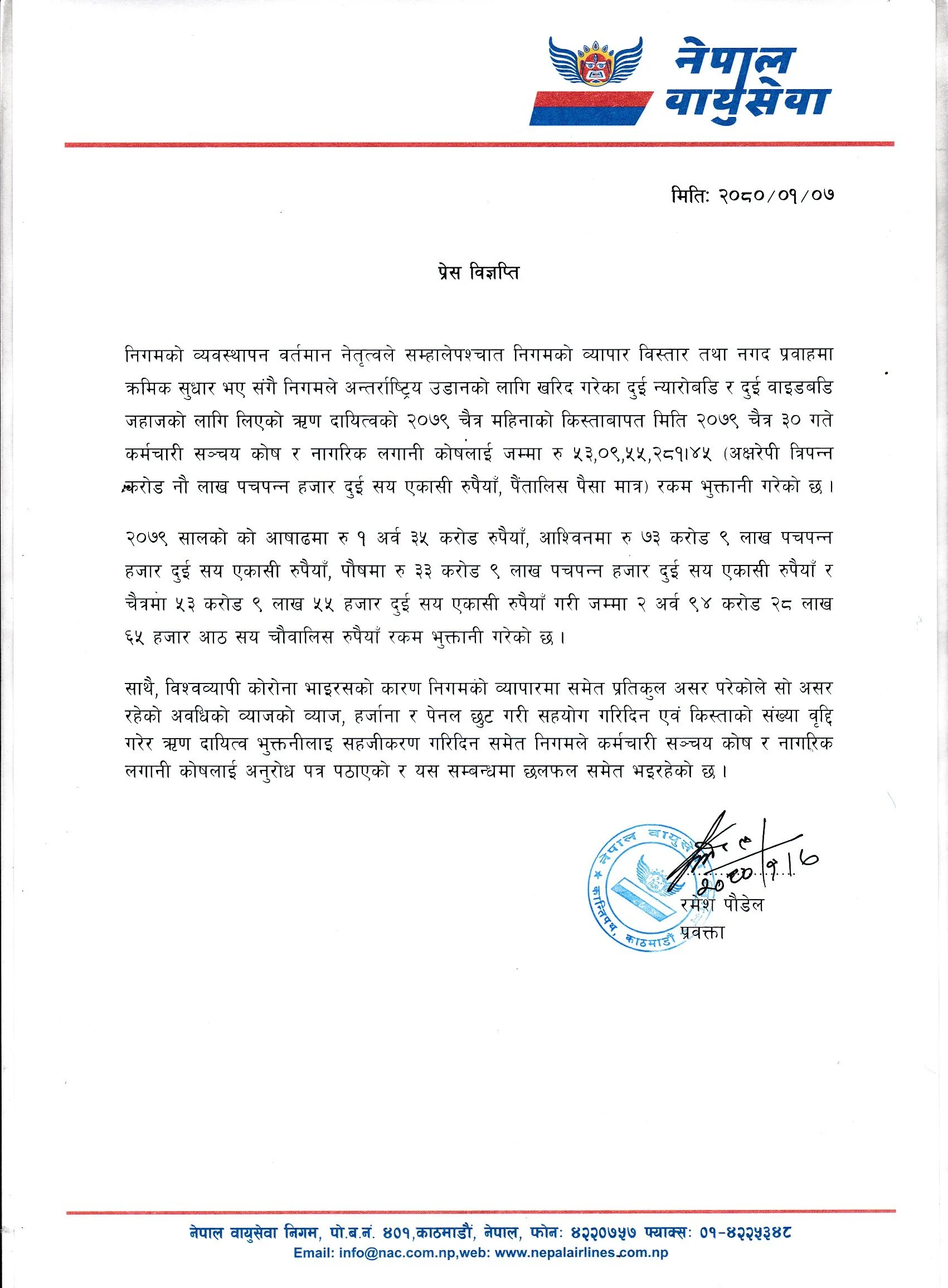 काठमाडौं । नेपाल वायुसेवा निगमले कोरानाकालको ब्याज, हर्जाना र पेनल छुट गर्न अनुरोध गरेको छ । निगमले बिहीबार एक विज्ञप्ति जारी गर्दै कर्मचारी सञ्चय कोष र नागरिक लगानी कोषलाई हर्जाना छुट गर्न अनुरोध गरेको हो ।
