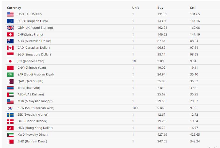 जसअनुसार अमेरिकी डलर एकको खरिददर १३१ रुपैयाँ ५ पैसा र बिक्रीदर १३१ रुपैयाँ ६५ पैसा रहेको छ । त्यसैगरी युरोपियन युरो एकको खरिददर १४३ रुपैयाँ ५० पैसा र बिक्रीदर १४४ रुपैयाँ १६ पैसा रहेको छ ।