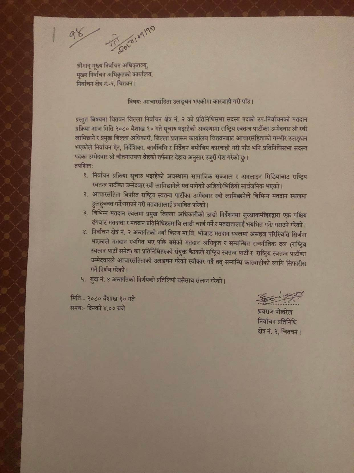 मतदान प्रक्रिया चलिरहेको अवस्थामा सामाजिक सञ्जाल र अनलाइन मिडियाबाट राष्ट्रिय स्वतन्त्र पार्टीका उम्मेदवार रवि लामिछानेले मत मागेको अडिओरभिडिओ सार्वजनिक भएको, आचारसंहिताविपरीत विभिन्न मतदानस्थलमा हुलहुज्जत गर्नेरगराउने गरी मतदातालाई प्रभावित पारेको उजुरीमा उल्लेख छ ।